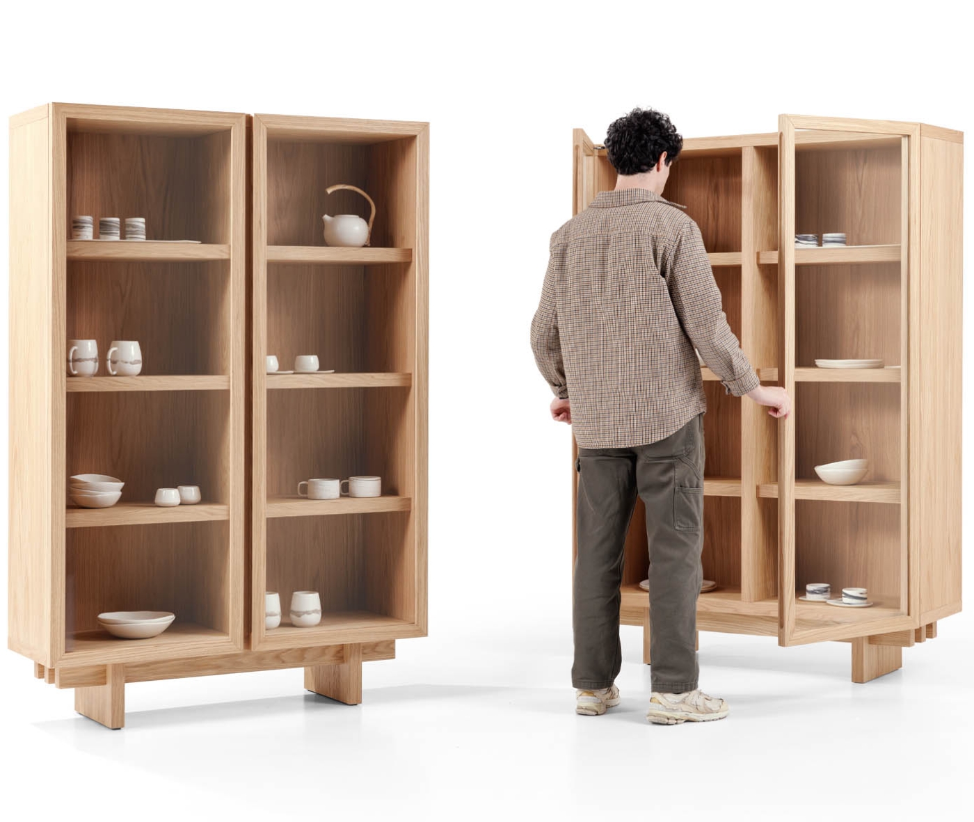 A defining characteristic of the collection is its interlocking structure: precise perpendicular lines intersect to form a balanced architectural framework that is both functional and sculptural.