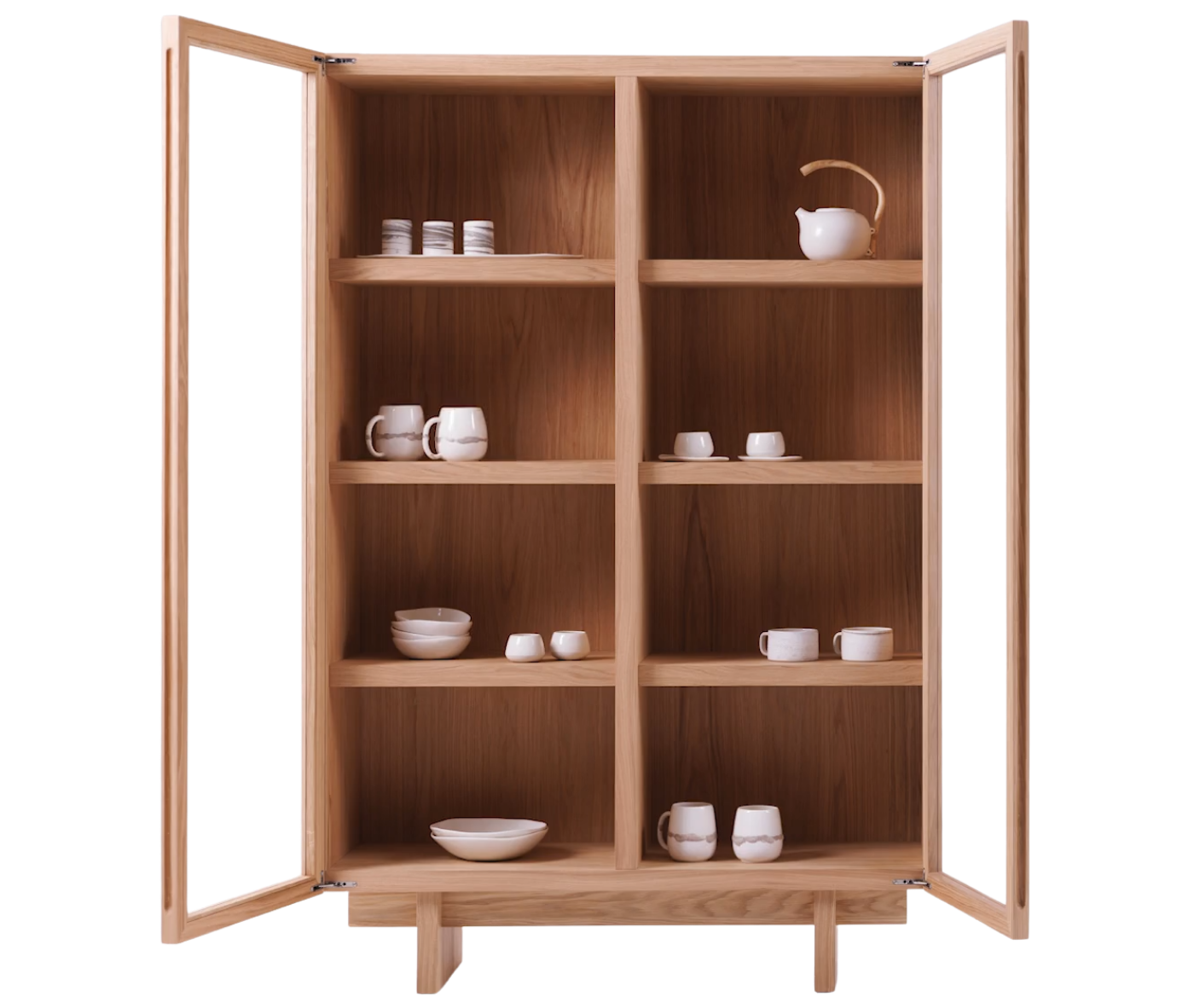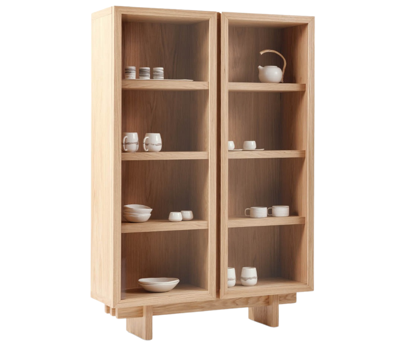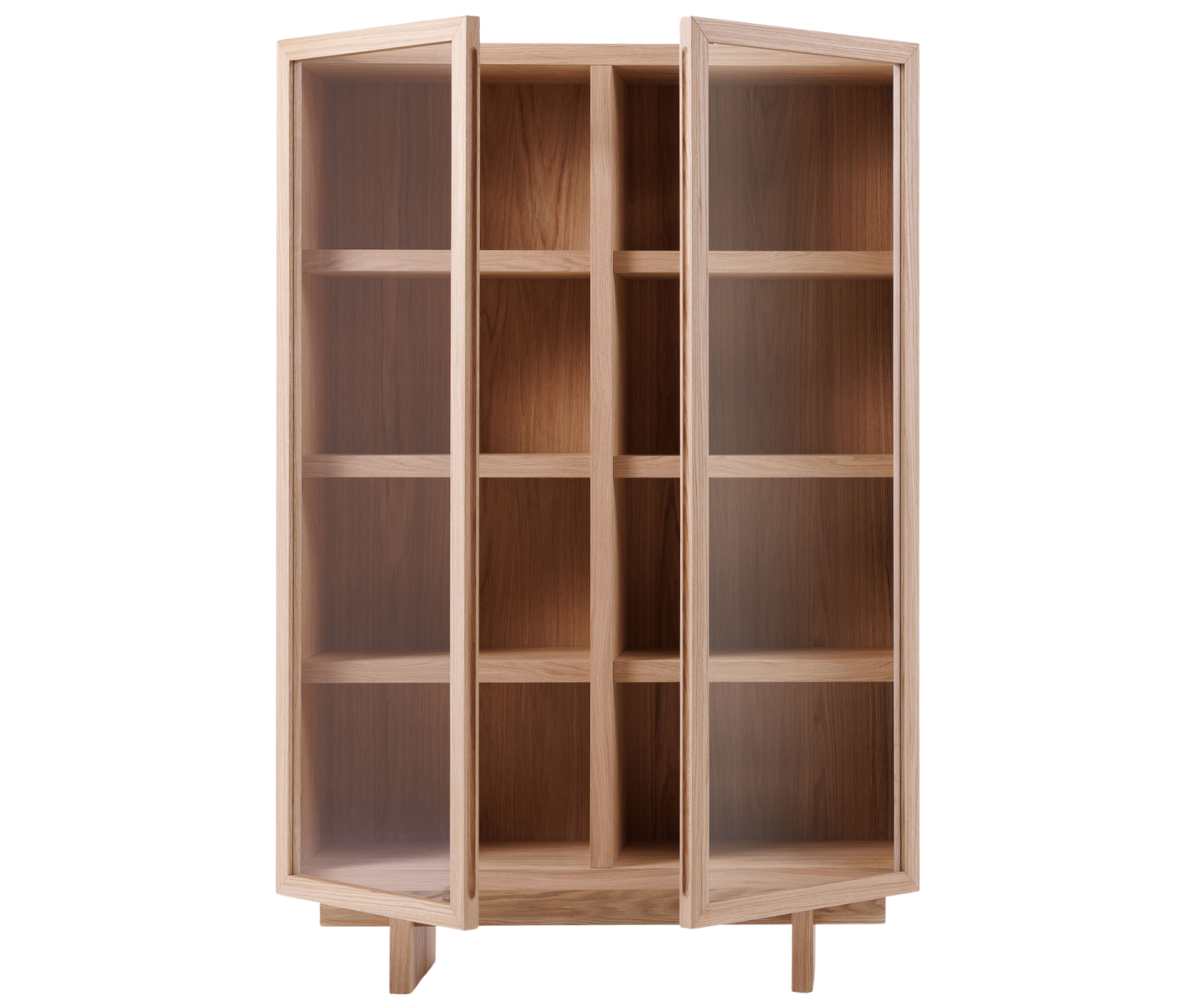 The Essence ES 120180GC bookshelf features a refined oak or walnut-veneered structure paired with glass-front doors that elegantly frame and protect the contents within. The transparency of the glass lightens the composition while allowing the warmth of the wood and the objects displayed inside to remain visually present.