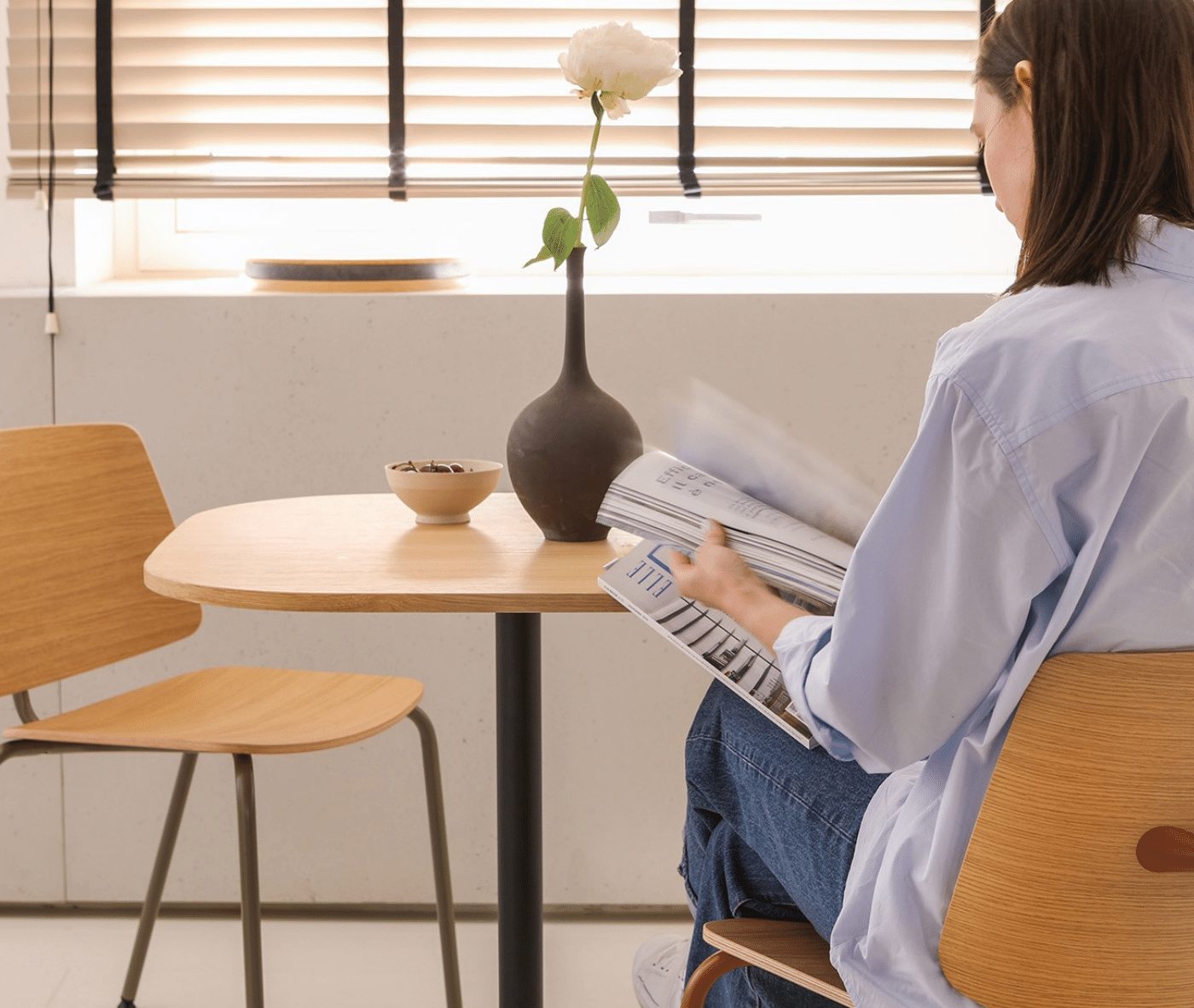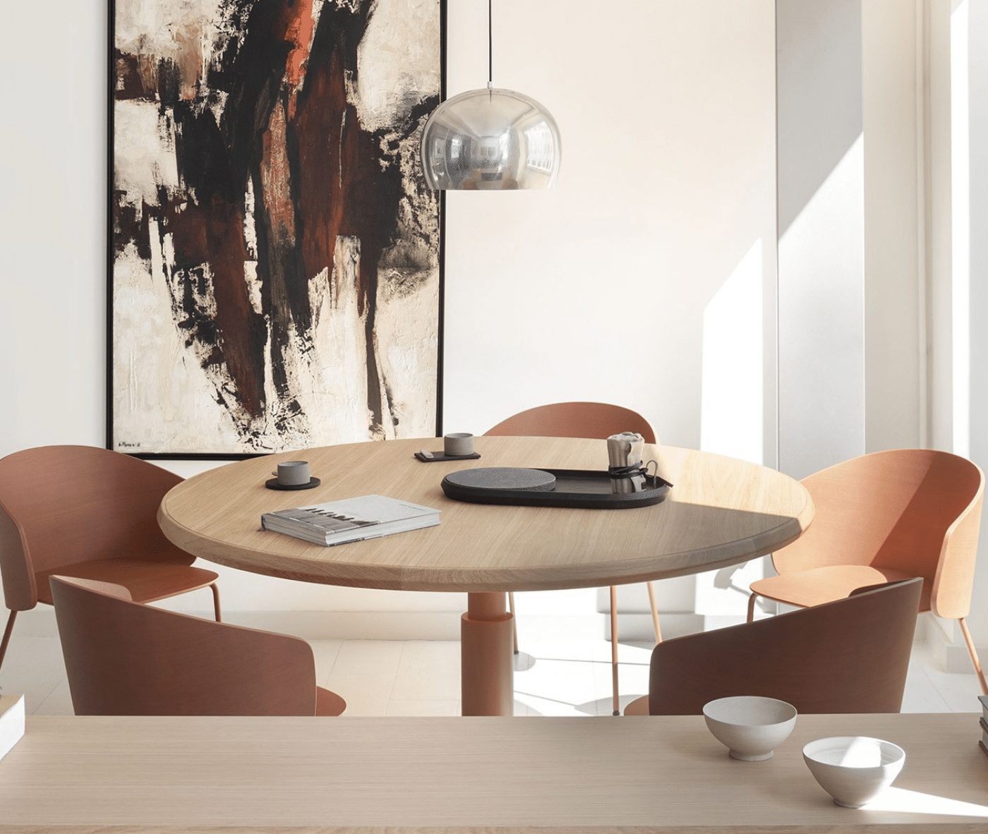 The tabletop features beech plywood with solid wood edging, while the sturdy base consists of a central concentric steel column, available in a variety of colours. The table’s unique design centres on the top profile, making the edge a focal point of both style and functionality. Its technical composition — including the solid wood frame, beech plywood core, and concentric steel base — embodies a harmonious blend of functionality and sophistication.