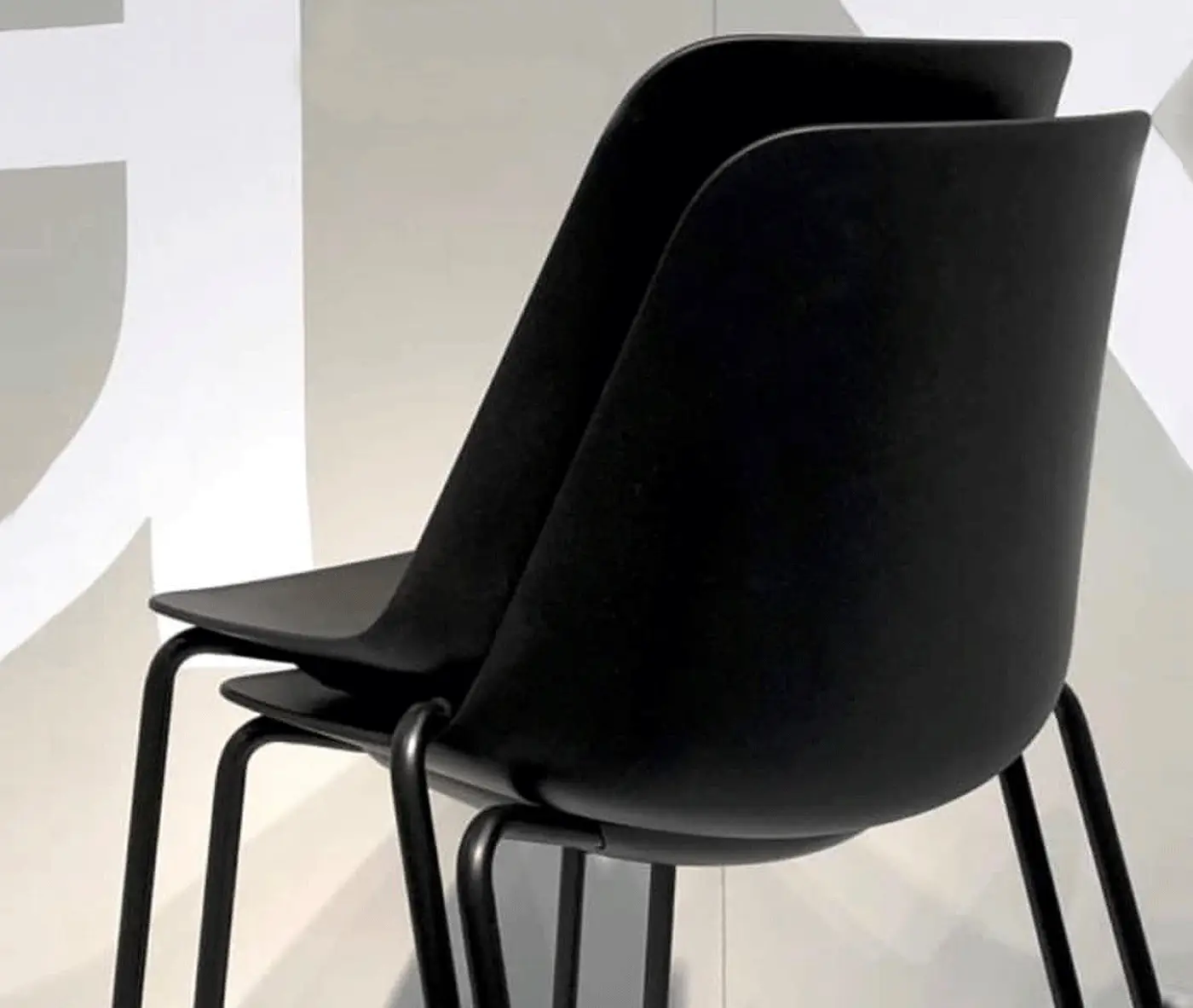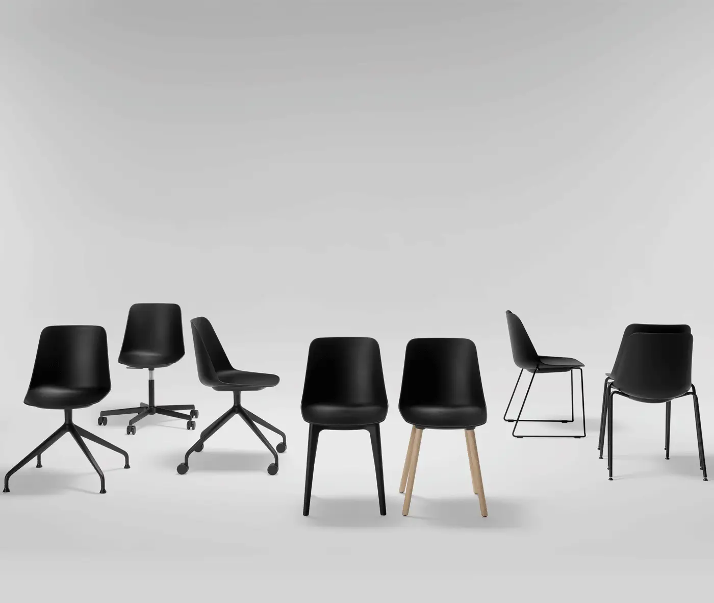 Designer Christoph Jenni describes the Max collection as “a sort of mix and match attitude takes place in the association of components, materials and products themselves. It is an open and adaptive program driven by the search for comfort, versatility and sustainability. We look at our collection in relation to the multitude of contexts and possible combinations hidden behind needs and projects. There is a whole new concept behind this product development. All the different frames have been thought and designed to fit both products, chair and armchair. A “one fits all” approach in line with the crucial values of functionality and flexibility. Moreover, recycled organic polypropylene and eco–friendly recycled wood have been added to our collection. These new additions are used for bases as well as shells. The result is a monolith object made from the same reclaimed material, a well–proportioned chair where the structure is hidden in the form itself.”