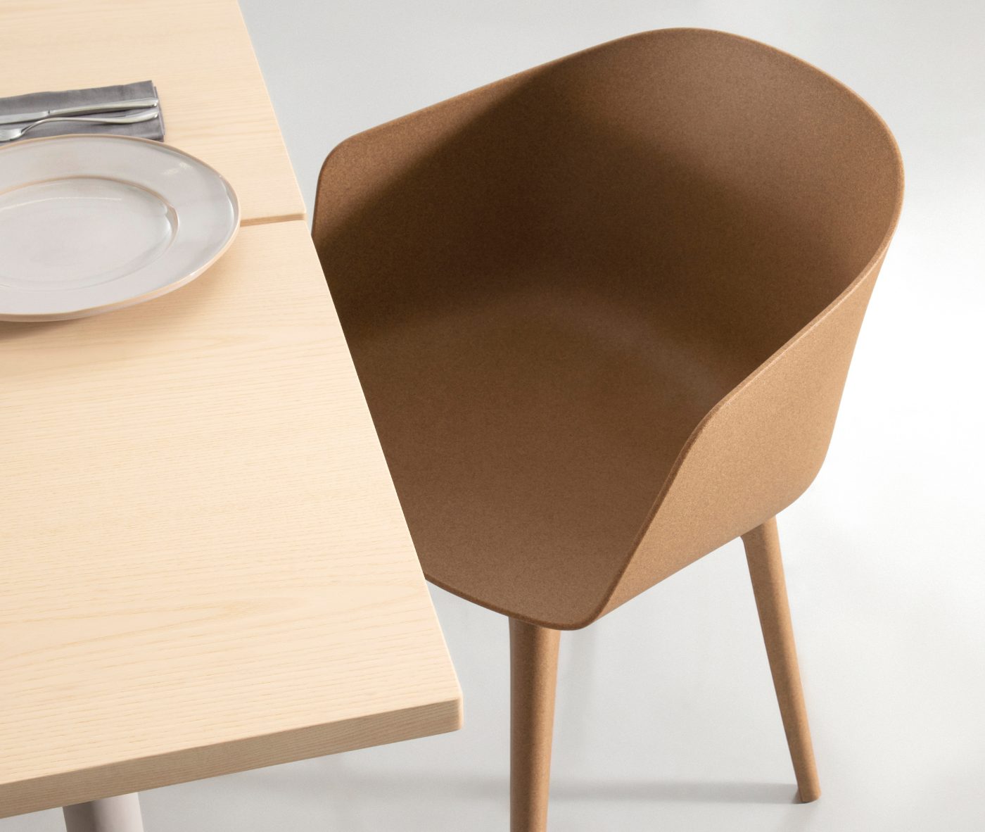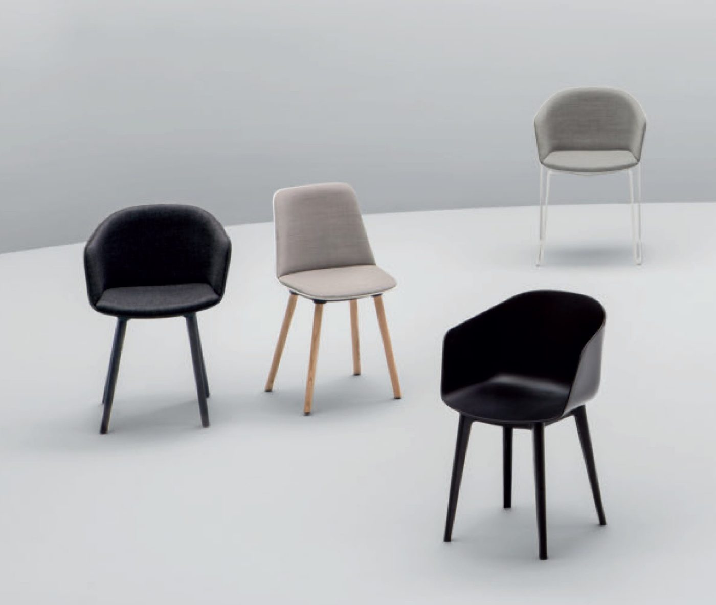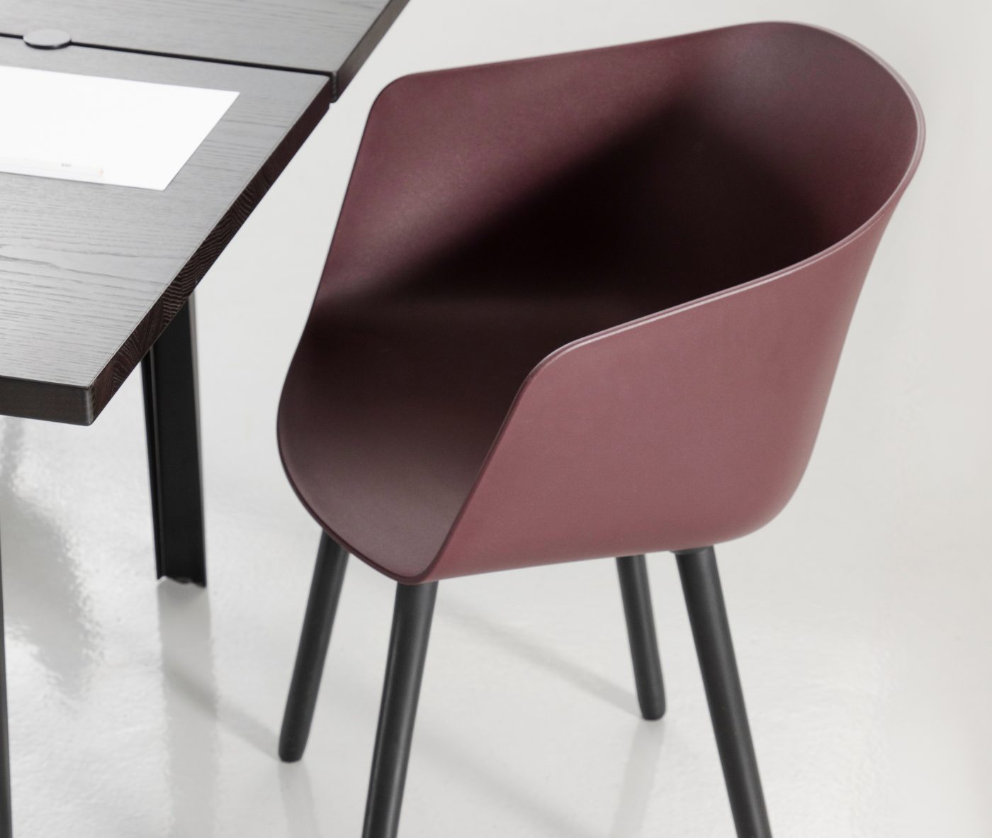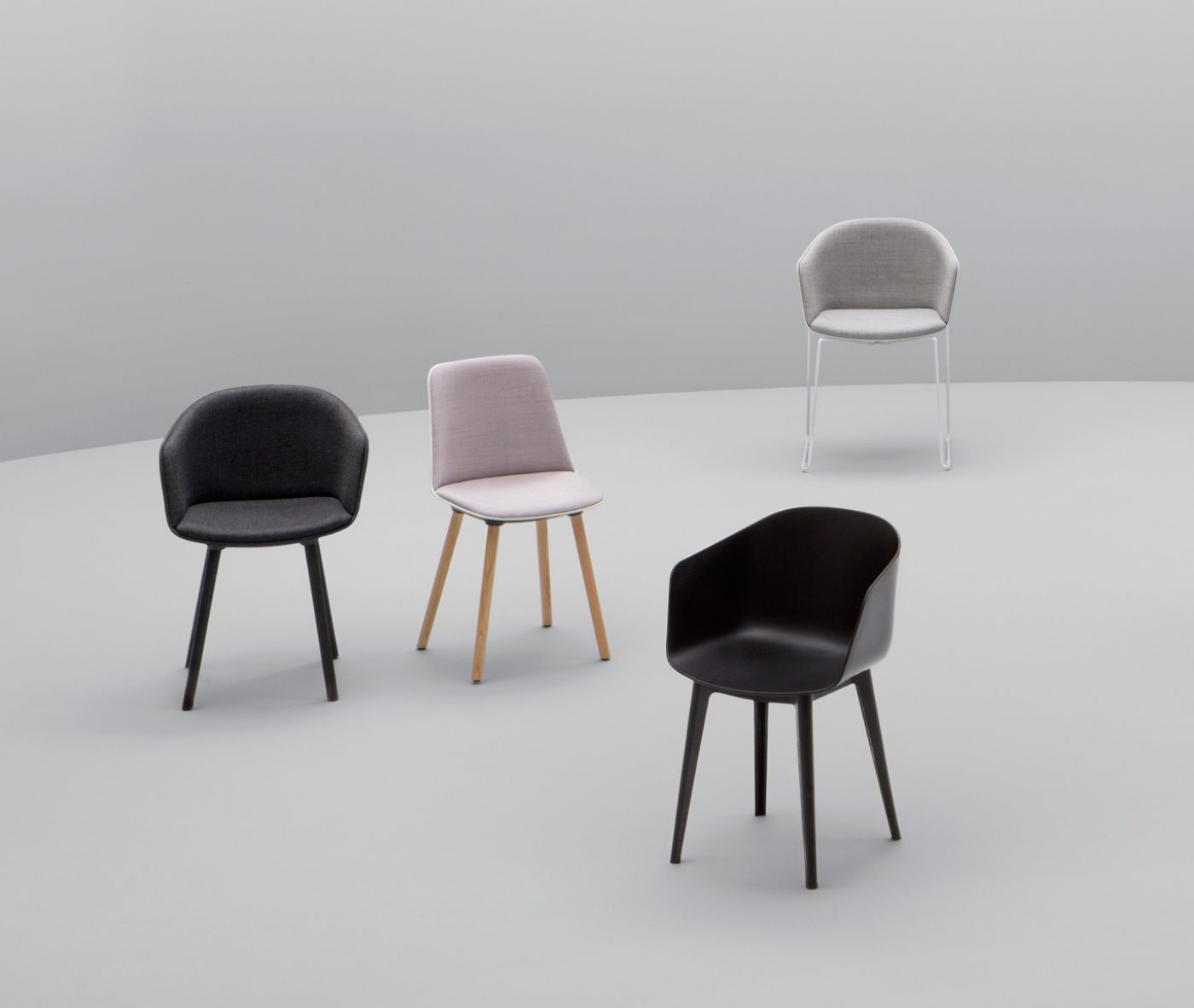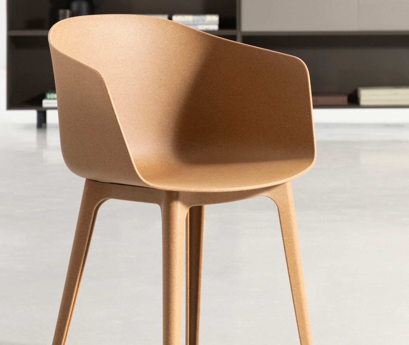 Designer Christoph Jenni describes the Max collection as “a sort of mix and match attitude takes place in the association of components, materials and products themselves. It is an open and adaptive program driven by the search for comfort, versatility and sustainability. We look at our collection in relation to the multitude of contexts and possible combinations hidden behind needs and projects. There is a whole new concept behind this product development. All the different frames have been thought and designed to fit both products, chair and armchair. A “one fits all” approach in line with the crucial values of functionality and flexibility. Moreover, recycled organic polypropylene and eco–friendly recycled wood have been added to our collection. These new additions are used for bases as well as shells. The result is a monolith object made from the same reclaimed material, a well–proportioned chair where the structure is hidden in the form itself.”