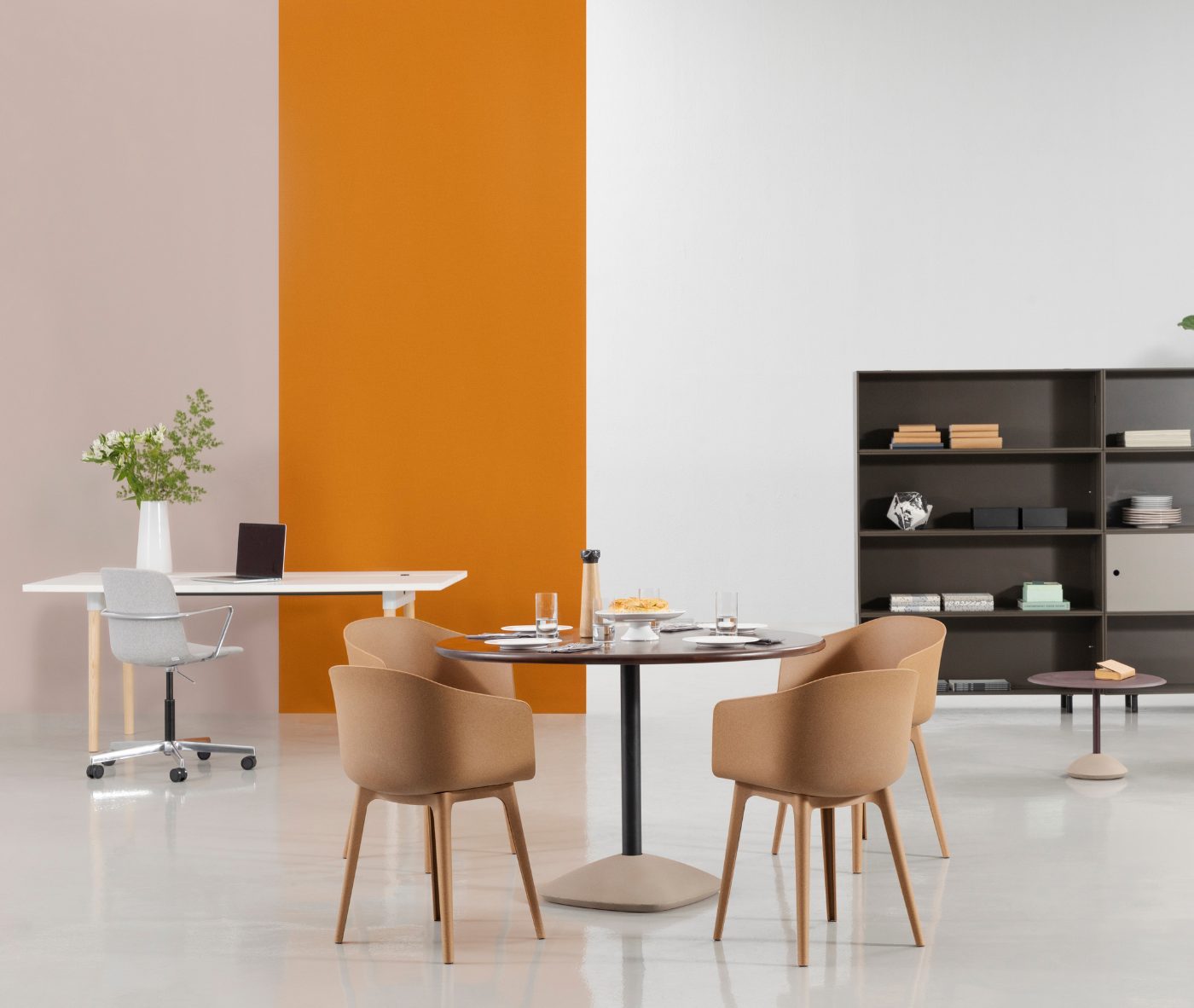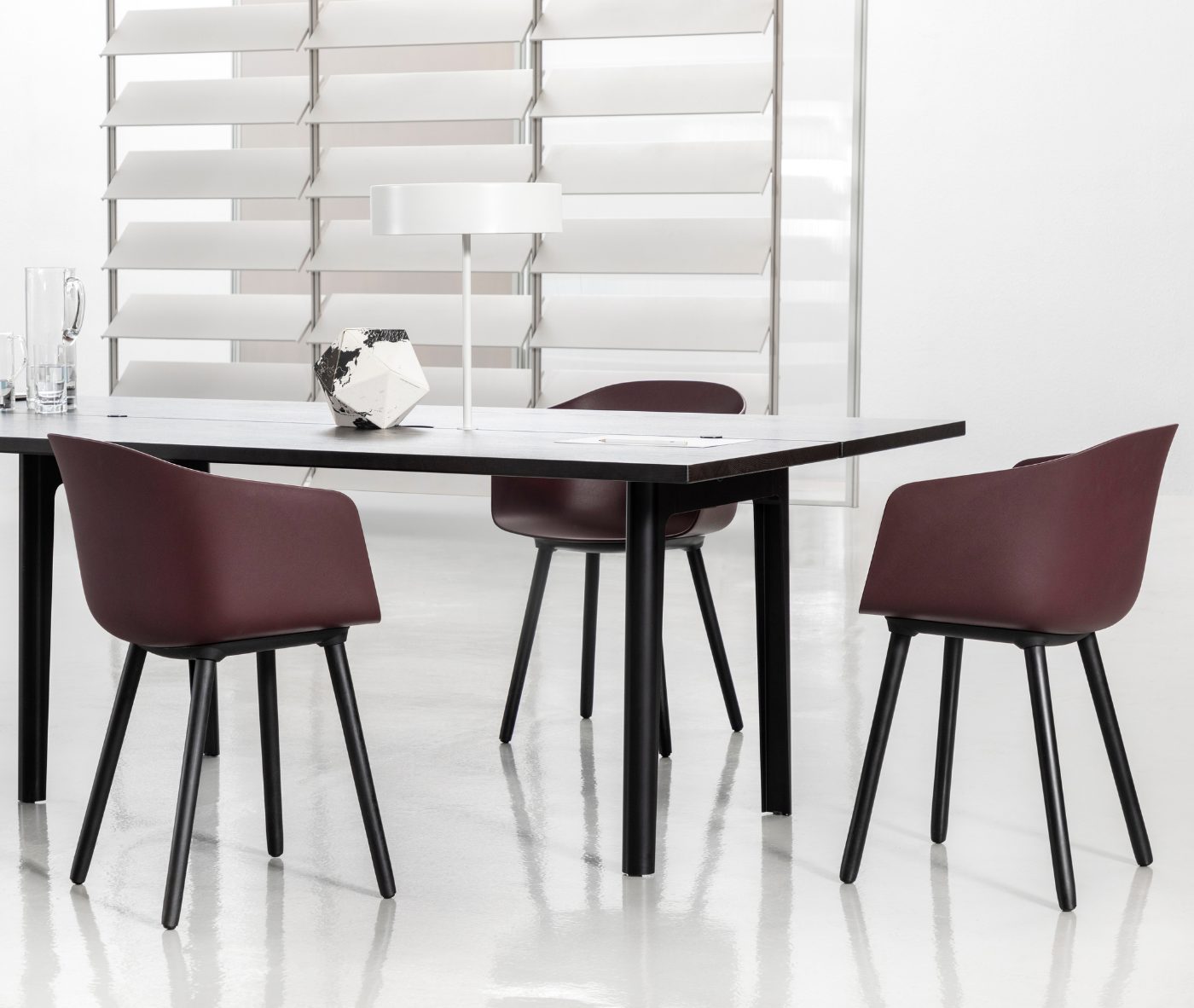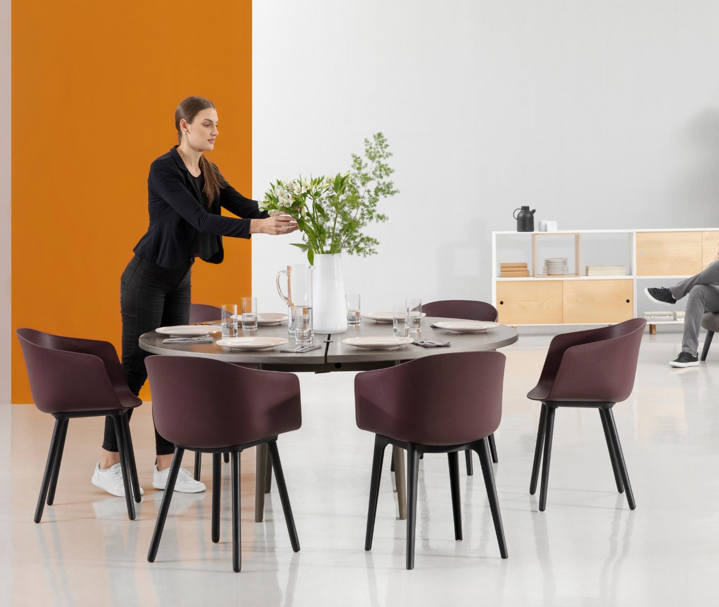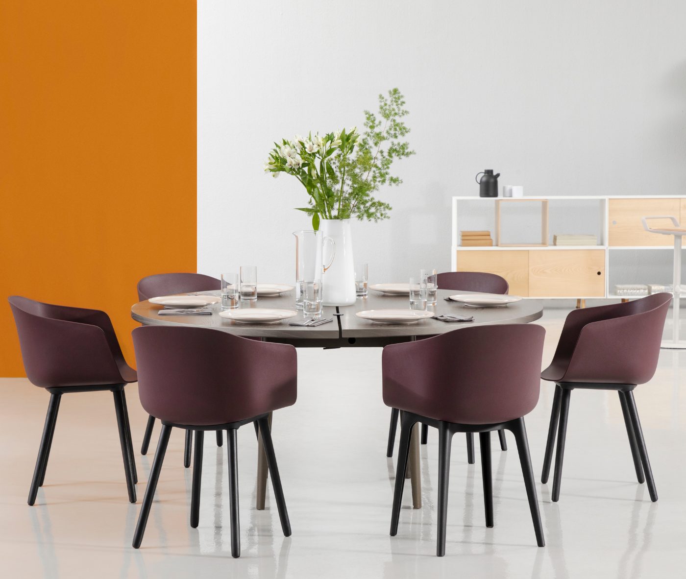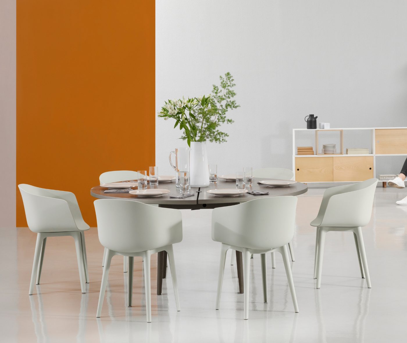 Designer Christoph Jenni describes the Max collection as “a sort of mix and match attitude takes place in the association of components, materials and products themselves. It is an open and adaptive program driven by the search for comfort, versatility and sustainability. We look at our collection in relation to the multitude of contexts and possible combinations hidden behind needs and projects. There is a whole new concept behind this product development. All the different frames have been thought and designed to fit both products, chair and armchair. A “one fits all” approach in line with the crucial values of functionality and flexibility. Moreover, recycled organic polypropylene and eco–friendly recycled wood have been added to our collection. These new additions are used for bases as well as shells. The result is a monolith object made from the same reclaimed material, a well–proportioned chair where the structure is hidden in the form itself.”