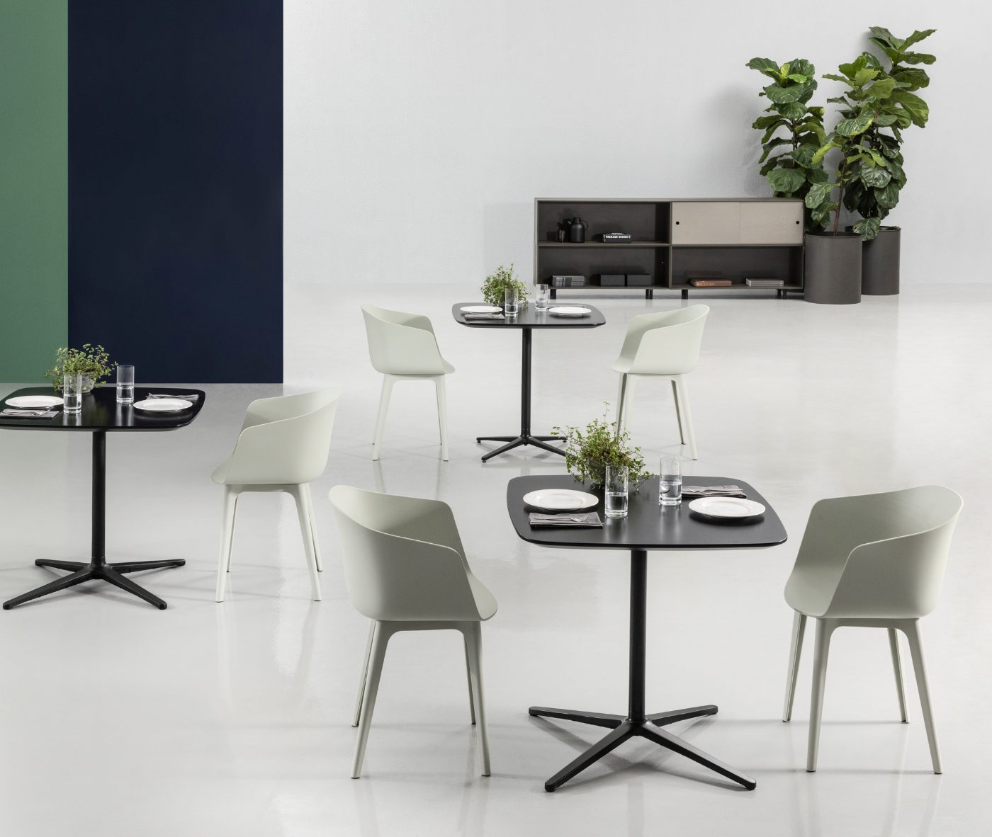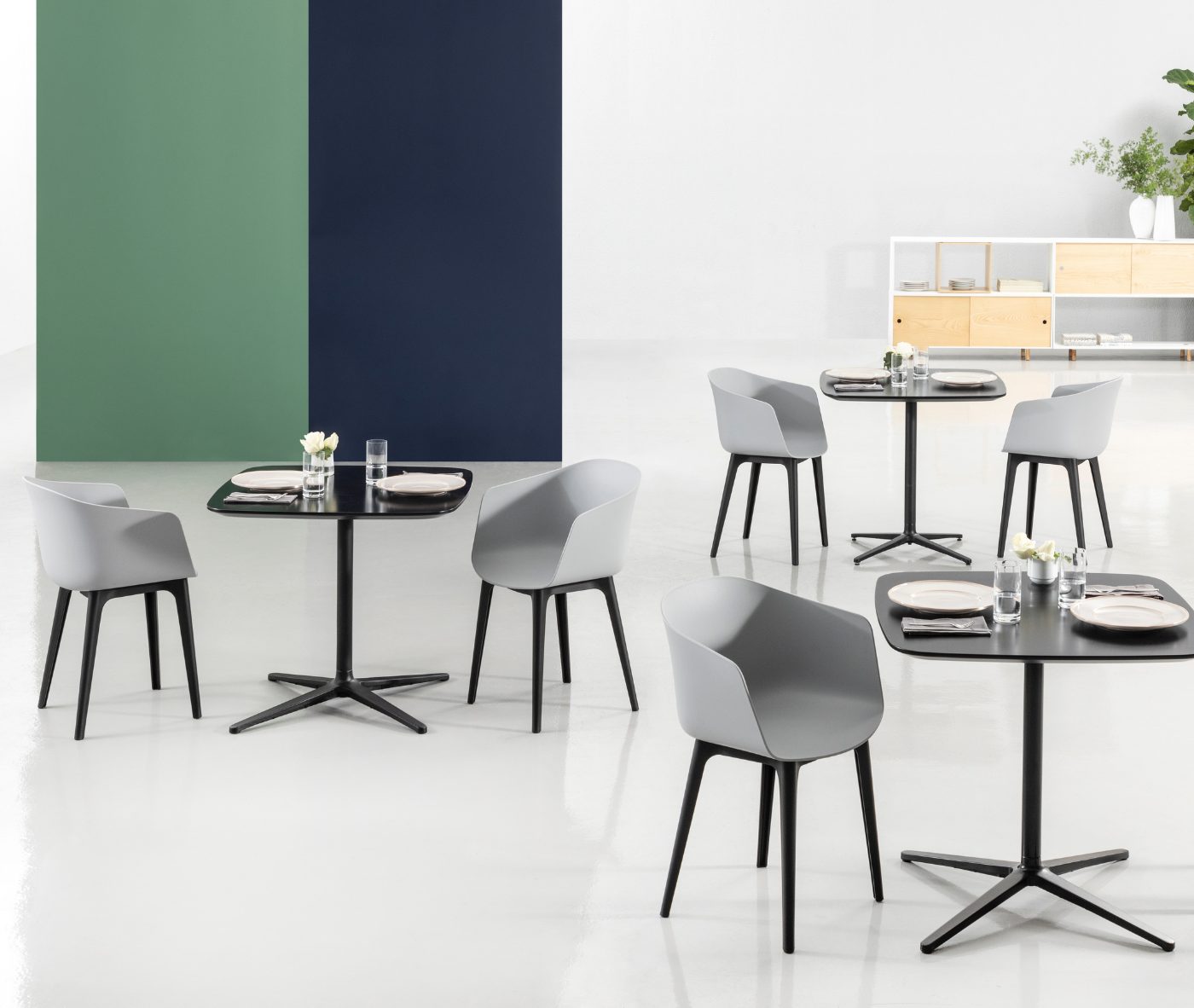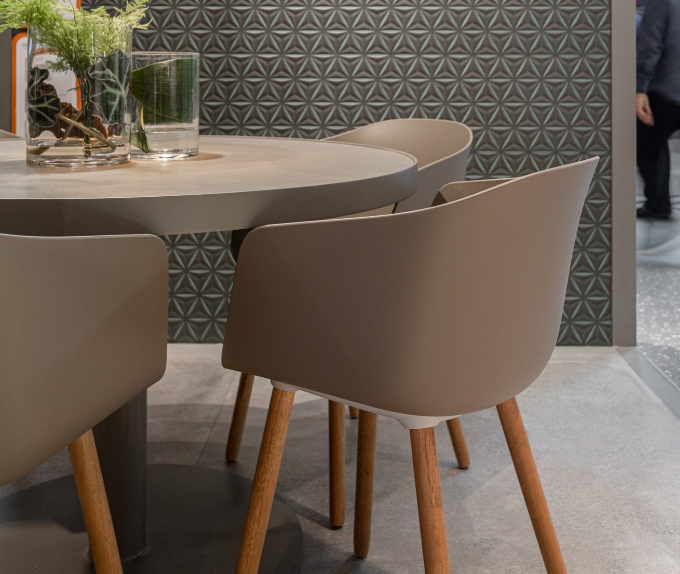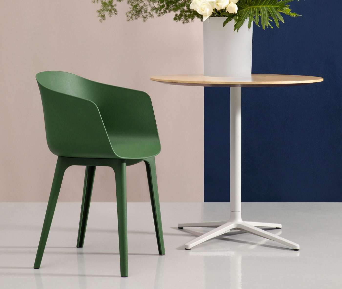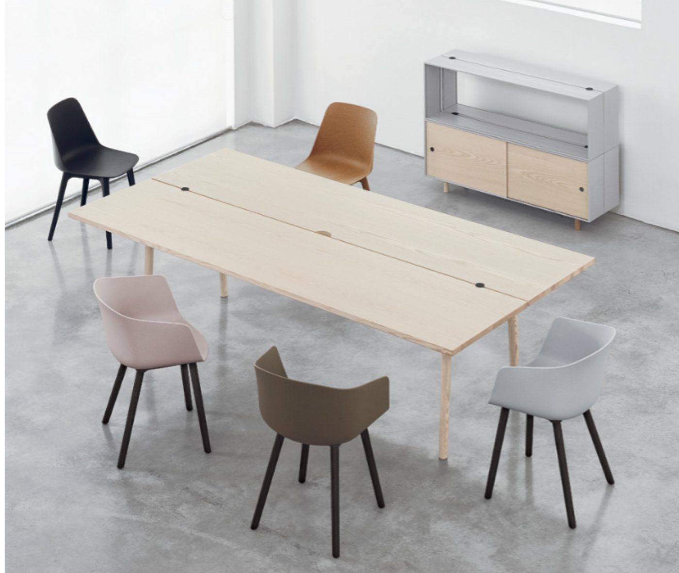 Designer Christoph Jenni describes the Max collection as “a sort of mix and match attitude takes place in the association of components, materials and products themselves. It is an open and adaptive program driven by the search for comfort, versatility and sustainability. We look at our collection in relation to the multitude of contexts and possible combinations hidden behind needs and projects. There is a whole new concept behind this product development. All the different frames have been thought and designed to fit both products, chair and armchair. A “one fits all” approach in line with the crucial values of functionality and flexibility. Moreover, recycled organic polypropylene and eco–friendly recycled wood have been added to our collection. These new additions are used for bases as well as shells. The result is a monolith object made from the same reclaimed material, a well–proportioned chair where the structure is hidden in the form itself.”