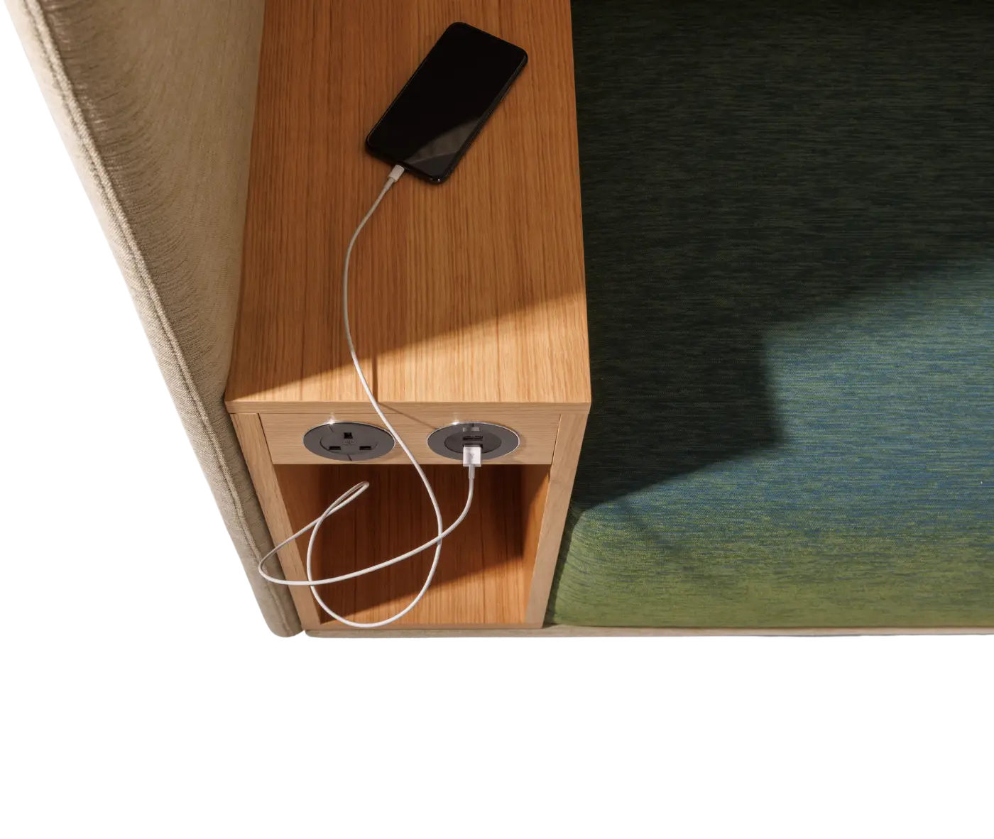 Don’t forget to discuss your technology requirements with our team. Power and USB can easily be integrated into this product. Optional power or USB sockets, wireless charging and task lighting complete the setting at an additional cost.