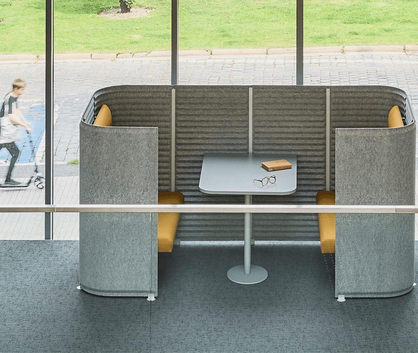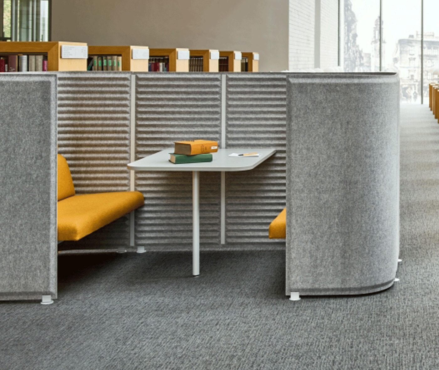 Light Grey Felt Exterior – Seats Upholstered in Camira Era Signature CSE35 (Green) – Table top in White Melamine
