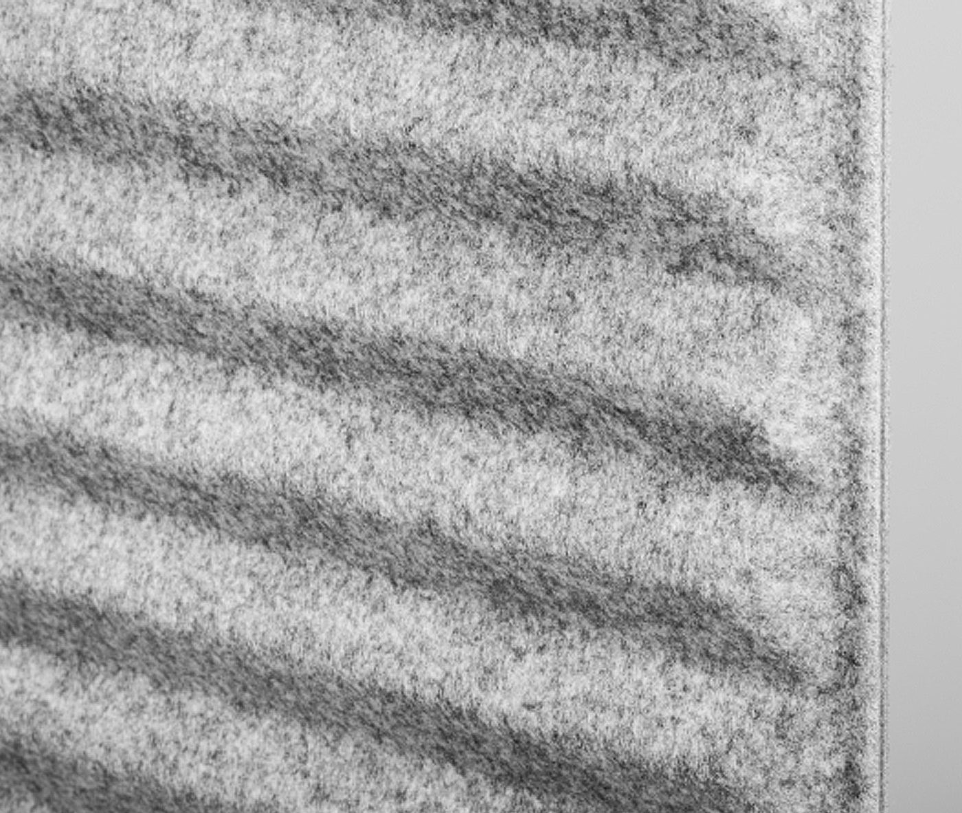 A unique feature of Soundroom is the use of light polyester felt. The non-woven fabric covers on both sides a honeycomb-shaped cardboard core with hexagonal cells. The resulting element, produced in the process of thermoforming, is a lightweight, extremely rigid and visually attractive panel that is pleasant and warm to the touch. The panels have a characteristic wavy shape on the inner side and are flat on the outer side.
