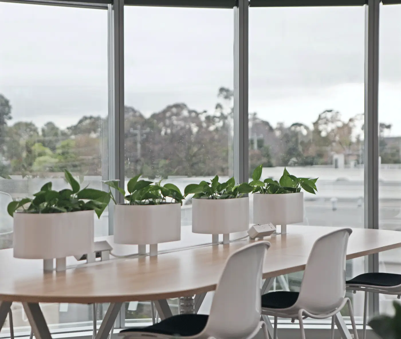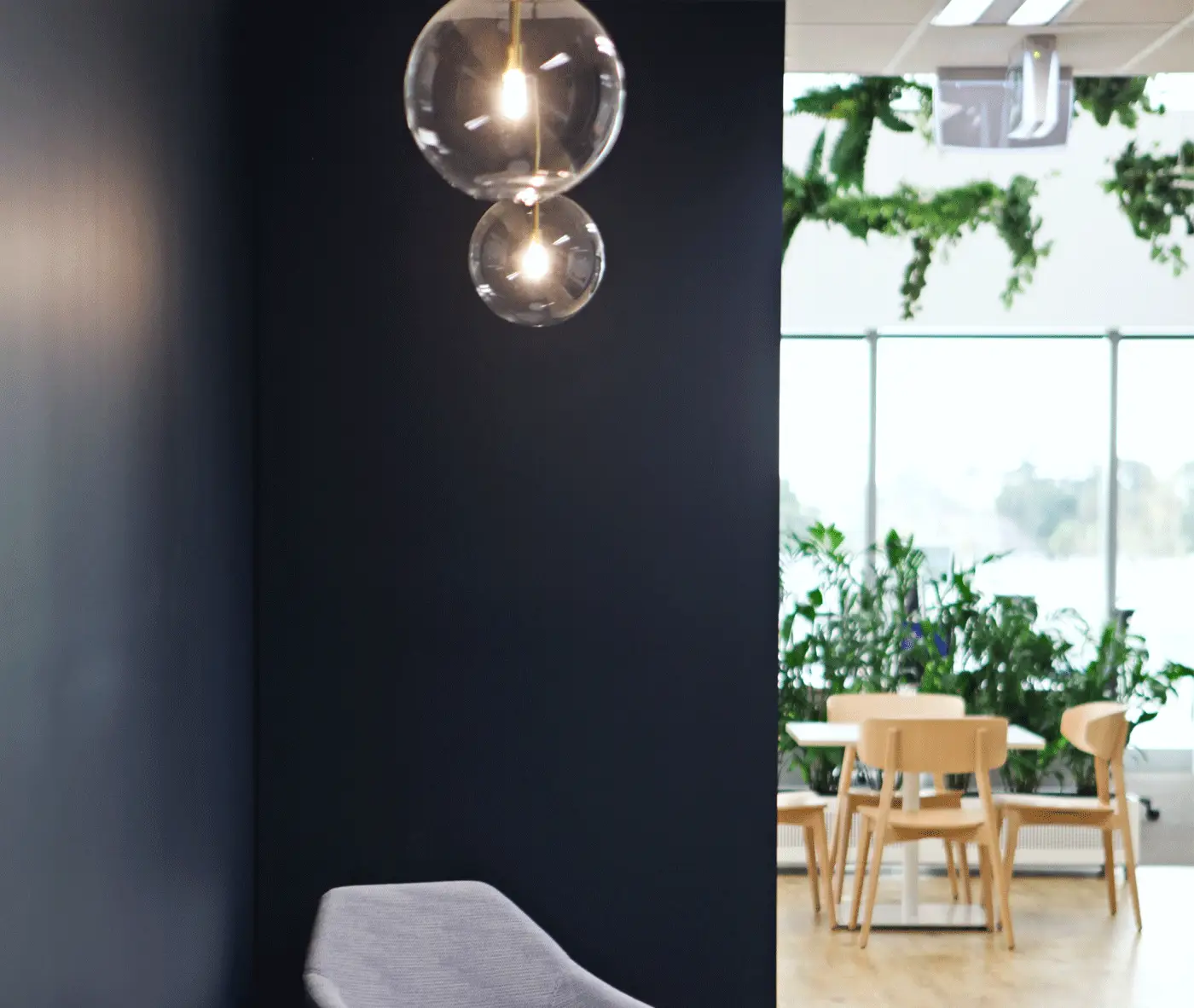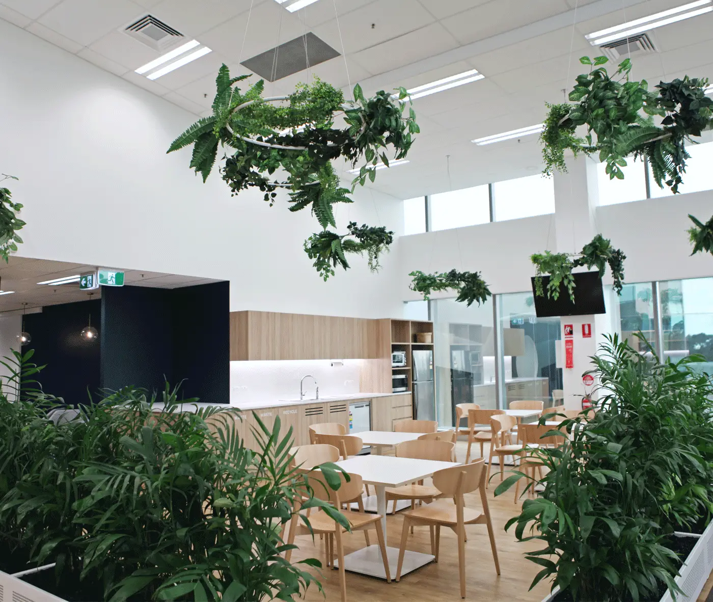The warm and natural Beech tones of our Hellen Plus SE01 chair perfectly contrast, yet compliment the lush greenery in the Cafe/Kitchen area of the workplace.