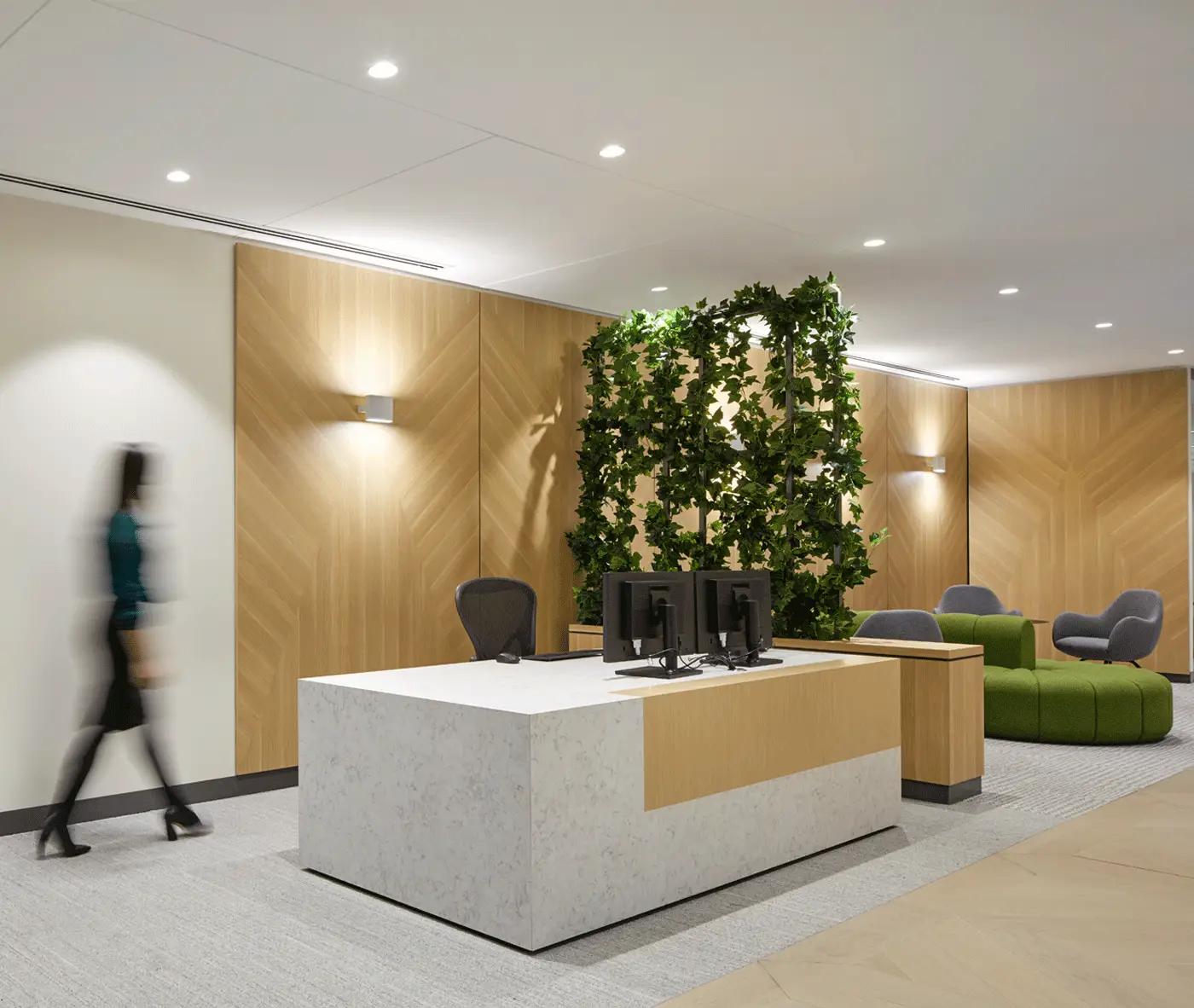 Lightness and a warm accessibility are expressed through the design in the material palette and colourways. Crisp white walls paired with light timber parquet wall details and greenery bring in a fresh and friendly vibe.